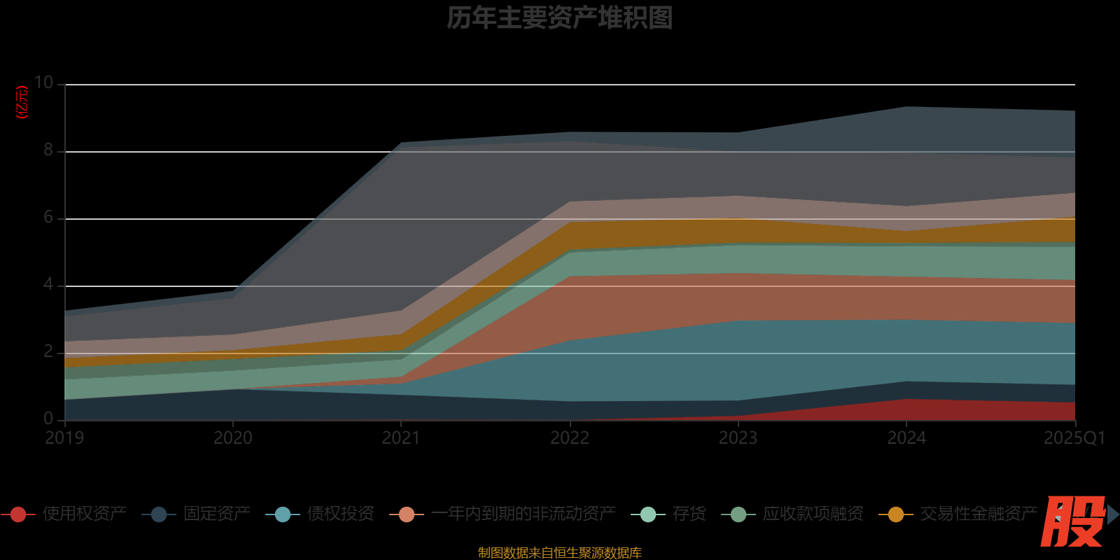 资产重大变化方面,截至2025年一季度末,公司货币资金较上年末减少34.05%,占公司总资产比重下降5.65个百分点;交易性金融资产合计较上年末增加114.99%,占公司总资产比重上升4.4个百分点;存货较上年末增加9.76%,占公司总资产比重上升1.09个百分点;使用权资产较上年末减少16.94%,占公司总资产比重下降1.06个百分点。